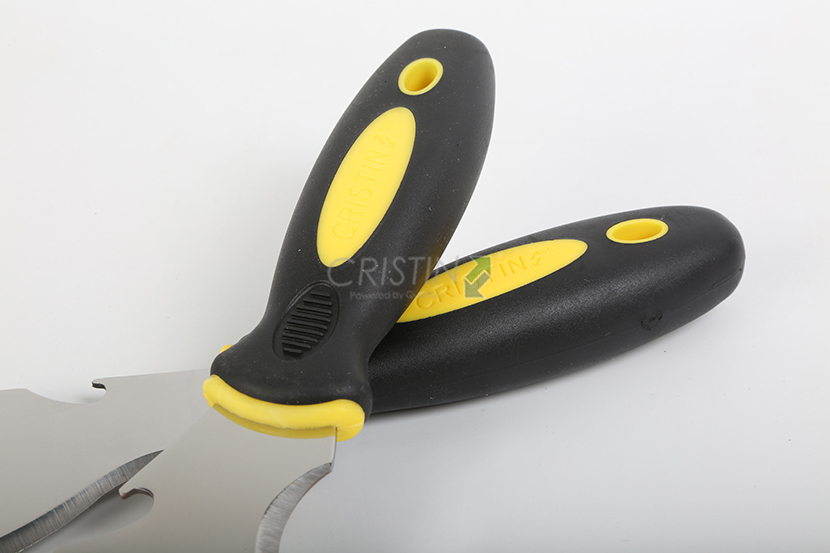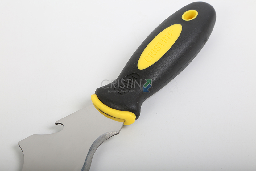 加厚型不銹鋼油灰刀,除具有普 通油灰刀的傳統(tǒng)特點(diǎn)外還具有開(kāi) 啟瓶蓋、 起釘功能;刀體圓弧可 以在清洗滾筒時(shí)擠出多余涂料; 鋒利刀尖可用于挖開(kāi)破損開(kāi)裂的 墻體;鋒利的刀刃用于刮鏟效率 極高。